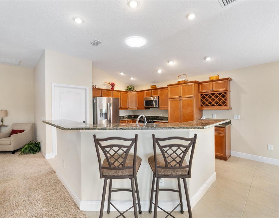 STUNNING WATER VIEW | LILY MODEL | 3 BEDROOMS | 2-CAR + GOLF CART GARAGE | VILLAGE OF GILCHRIST Welcome to this beautiful 3-BEDROOM, 2-BATH LILY MODEL in the highly desirable VILLAGE OF GILCHRIST, offering a TWO-CAR GARAGE PLUS GOLF CART GARAGE and BREATHTAKING WATER VIEWS. Step inside to an OPEN, LIGHT-FILLED FLOOR PLAN designed for comfortable living and effortless entertaining. The home features HIGH CEILINGS, a SOLAR TUBE FOR NATURAL LIGHT, and an inviting living area that flows seamlessly to the EXTENDED LANAI and tranquil POND VIEWS beyond. The kitchen and wet areas feature LIGHT TILE FLOORING, complemented by GRANITE COUNTERTOPS, a BREAKFAST BAR, and ABUNDANT CABINETRY including beautiful cabinets and a BUILT-IN WINE BAR—perfect for hosting friends and family. Enjoy your morning coffee in the bright KITCHEN NOOK OVERLOOKING THE LANAI AND WATER, creating a peaceful start to every day. The PRIMARY SUITE is spacious and airy, featuring TRAY CEILINGS and FOUR LARGE WINDOWS that fill the room with Florida sunshine. The PRIMARY BATH includes DUAL GRANITE VANITIES, an ELEGANT TILED WALK-IN SHOWER, and a CUSTOM WALK-IN CLOSET with ample shelving and storage. Two additional bedrooms are GENEROUSELY SIZED with HIGH CEILINGS and plenty of natural light, and the nearby GUEST BATHROOM features TILE FLOORING and GRANITE COUNTERTOPS. A convenient POCKET DOOR CREATES A PRIVATE GUEST SUITE AREA, ideal when hosting visitors. The true highlight of this home is the SPECTACULAR EXTENDED LANAI. Fully screened and stretching the FULL WIDTH OF THE HOME, this outdoor retreat offers STUNNING PANORAMIC POND VIEWS and multiple seating areas to relax and enjoy the FLORIDA LIFESTYLE. The lanai also features a GRANITE WET BAR WITH SINK, UNDER-COUNTER REFRIGERATOR, along with a WEBER GRILL, making it the perfect space for OUTDOOR DINING AND ENTERTAINING. Additional features include: • FREEZER IN THE GARAGE CONVEYS • UTILITY SINK IN GARAGE • INSIDE LAUNDRY • WORKBENCH AND GARAGE CABINETS CONVEY • INSULATED GARAGE DOORS • HVAC REPLACED IN 2022 • NOVA FILTRATION SYSTEM IN GARAGE (RECENTLY SERVICED) • HOME IS PARTIALLY FURNISHED. Room for a POOL! Located just minutes from BROWNWOOD PADDOCK SQUARE (2 MILES) and LAKE SUMTER LANDING (4.5 MILES), this home is perfectly positioned in the HEART OF THE VILLAGES. Enjoy easy access to SHOPPING, DINING, GOLF, AND RECREATION, including nearby EVANS PRAIRIE COUNTRY CLUB and BONIFAY COUNTRY CLUB. This beautiful WATERFRONT HOME combines LOCATION, VIEWS, AND LIFESTYLE. Be sure to watch the VIDEO TOUR and schedule your PRIVATE SHOWING TODAY!
